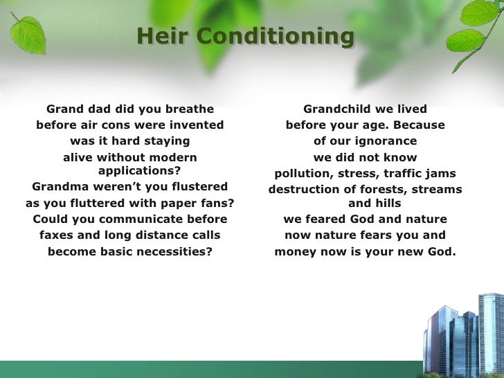 Gif. The poem heir conditioning is a dialogue between the grandparents and their grandchild about the differences in their generations. The poem also compare how the relationship between people are getting wider because of technology.