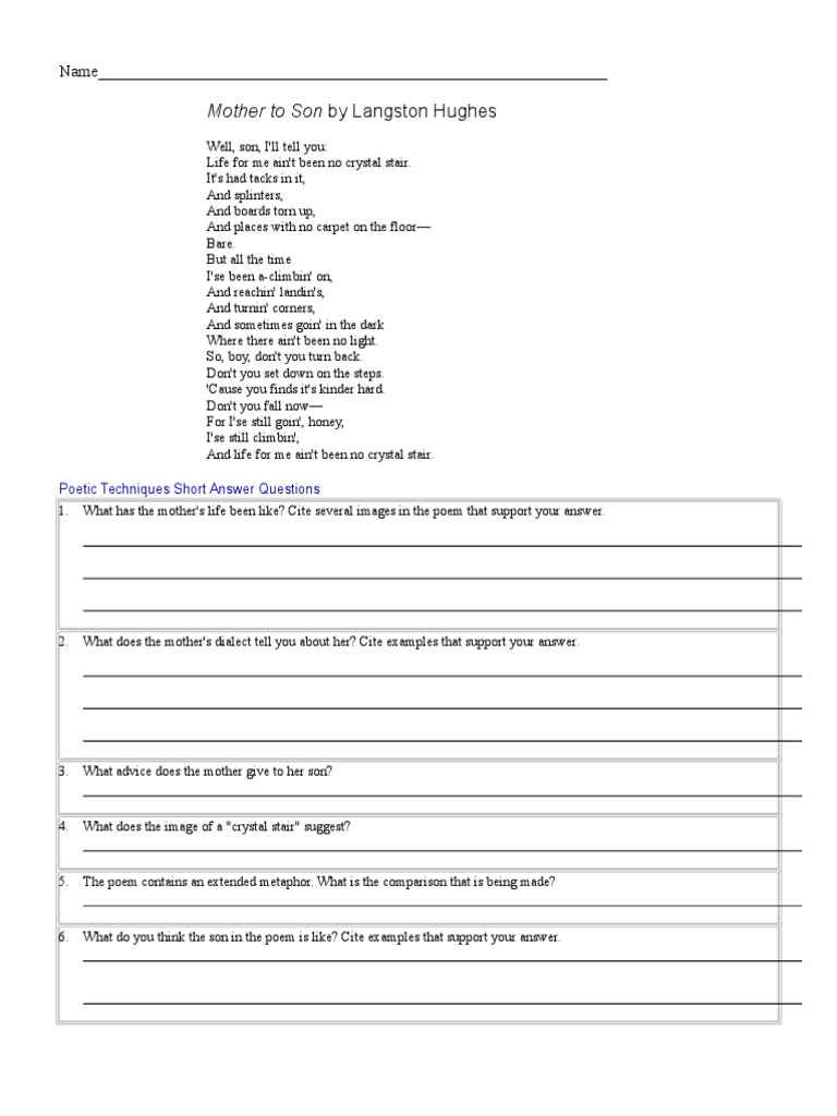 If possible, use what you know already to work out any options that are not possible. Play this game to review poetry. Since mother to son is a dramatic monologue, the primary purpose of hughes's word choices and line arrangements is to quickly and convincingly capture the speech and character of commentators on mother to son tend to focus on either racial, religious, or feminist themes for the poem's forms. Discuss other symbolic lines found in the poem and tell what they mean?
