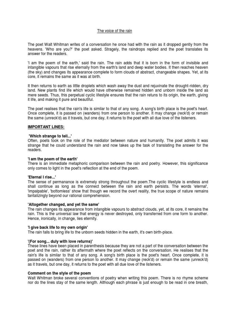 I paste it here below after this rain shall stop, a wondrous light will fill. I am the poem of earth, said the voice of the rain I am the poem of earth, said the voice of the rain. Poems entered on these pages are copyrighted by the authors who entered them.