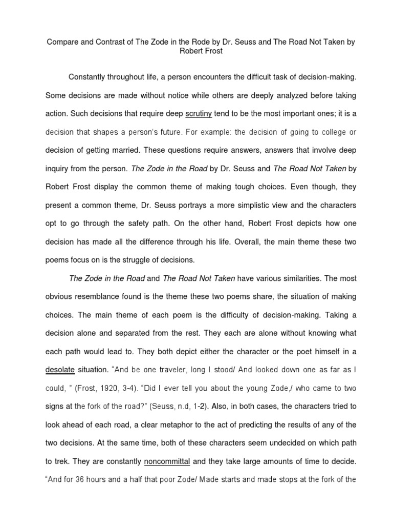 Two roads diverged in a yellow wood, and sorry i could not travel both and be one traveler, long i stood and looked down one as far as i could to where it bent in the undergrowth;