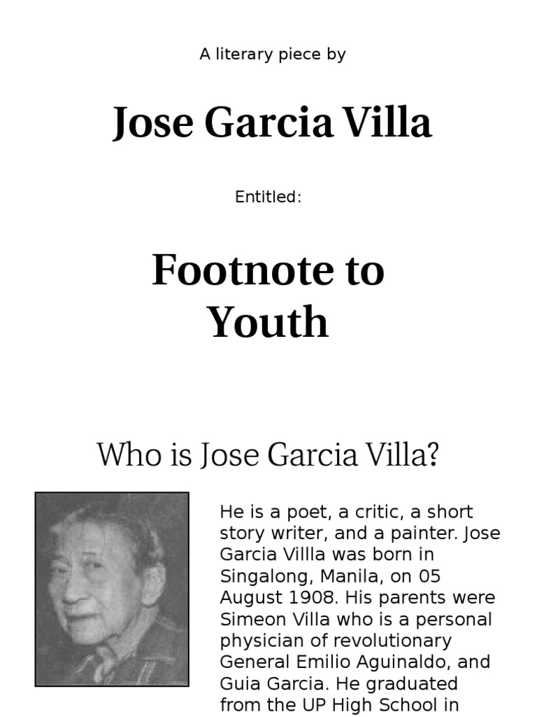 Simeon villa (emilio aguinaldo's physician) and guia garcia. Jose garcia villa / a celebration for edith sitwell first edition 1948. English español deutsch français 日本語 português 한국어. Villa has established an internationalreputation as a short story writer and as a poet, and was awarded the nationalartist award for literature by the philippine government.
