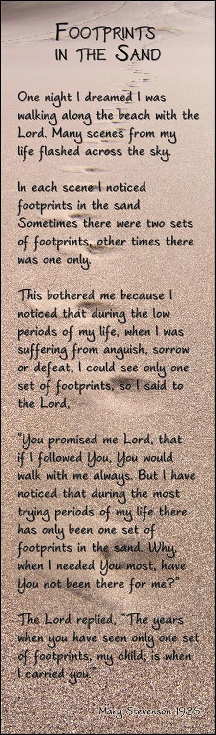 It describes a person who sees two pairs of footprints in the sand, one of which belonged to god and another to him or herself. There is a glare when read from an angle. Yes, i believe the poet's name is mary stevenson. One belonging to me and one to my lord.