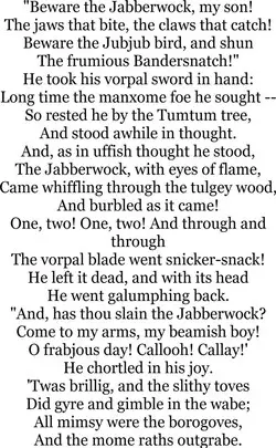 And as in uffish thought he stood, the jabberwock, with eyes of flame, came whiffling through the tulgey wood, and burbled as it came!